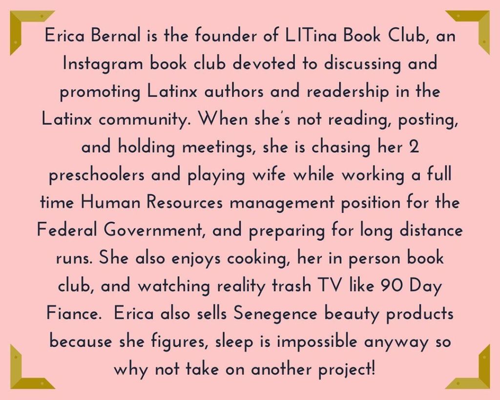 Last Wednesday, I featured a good friend of mine. Her name is Erica Bernal and is a hard working Latina mother of two toddlers. She has recently founded her newest book club: LITina Book Club which is a virtual Instagram book club focused on reading Latinx stories from Latinx Authors. The format is so unique and she is making a name for herself in the “Bookstagram” world. I chose to feature her as we relate well to one another. We work full time jobs and mom hard 24/7. Which is more than enough to do in a 7 day week!